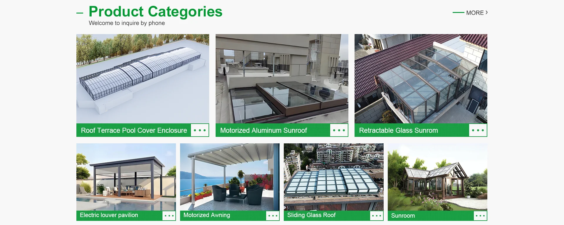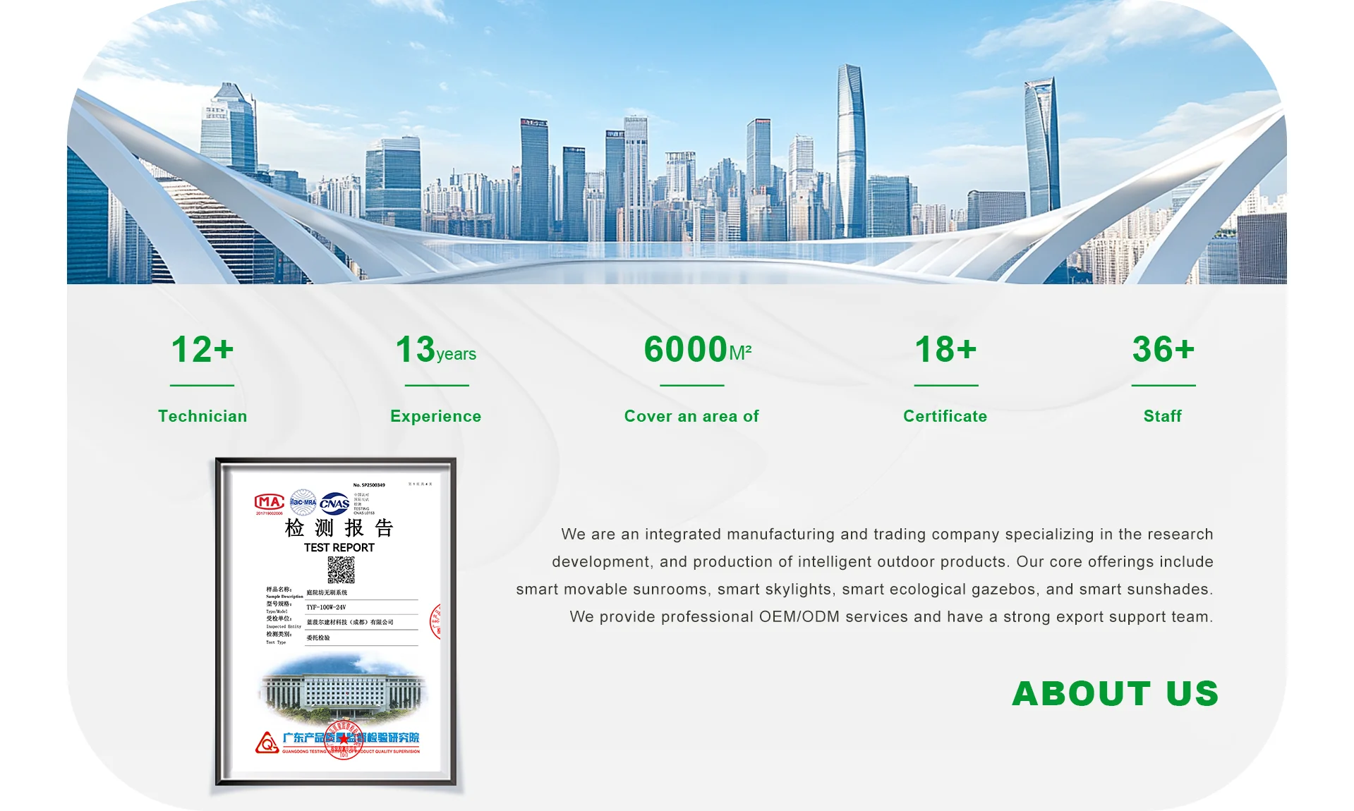 Productos principales:Pabellón de persiana eléctrica, Sunrom de vidrio retráctil, Sunroom, techo solar de aluminio motorizado, toldo motorizado